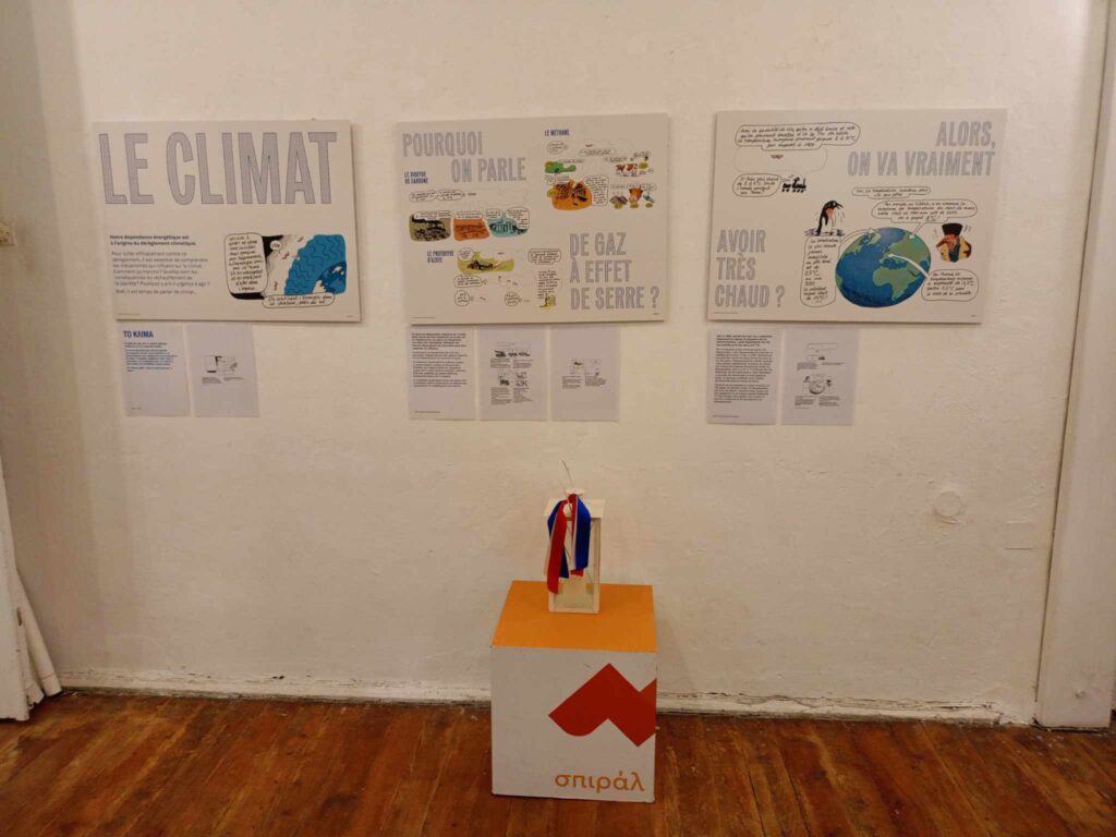 Η έκθεση διερευνά, μέσα από μια εμπεριστατωμένη και χιουμοριστική ματιά, τα αίτια και τις συνέπειες της κλιματικής αλλαγής, συμβάλλοντας στην ευαισθητοποίηση του κοινού για τις προκλήσεις της οικολογικής μετάβασης. Οι επισκέπτες έχουν τη δυνατότητα να απολαύσουν ένα ταξίδι γνώσης, μέσα από 26 καλαίσθητους πίνακες που περιέχουν ενδιαφέρουσες πληροφορίες, έξυπνα σκίτσα, χιουμοριστική προσέγγιση και εύληπτα κείμενα στα ελληνικά και στα γαλλικά.